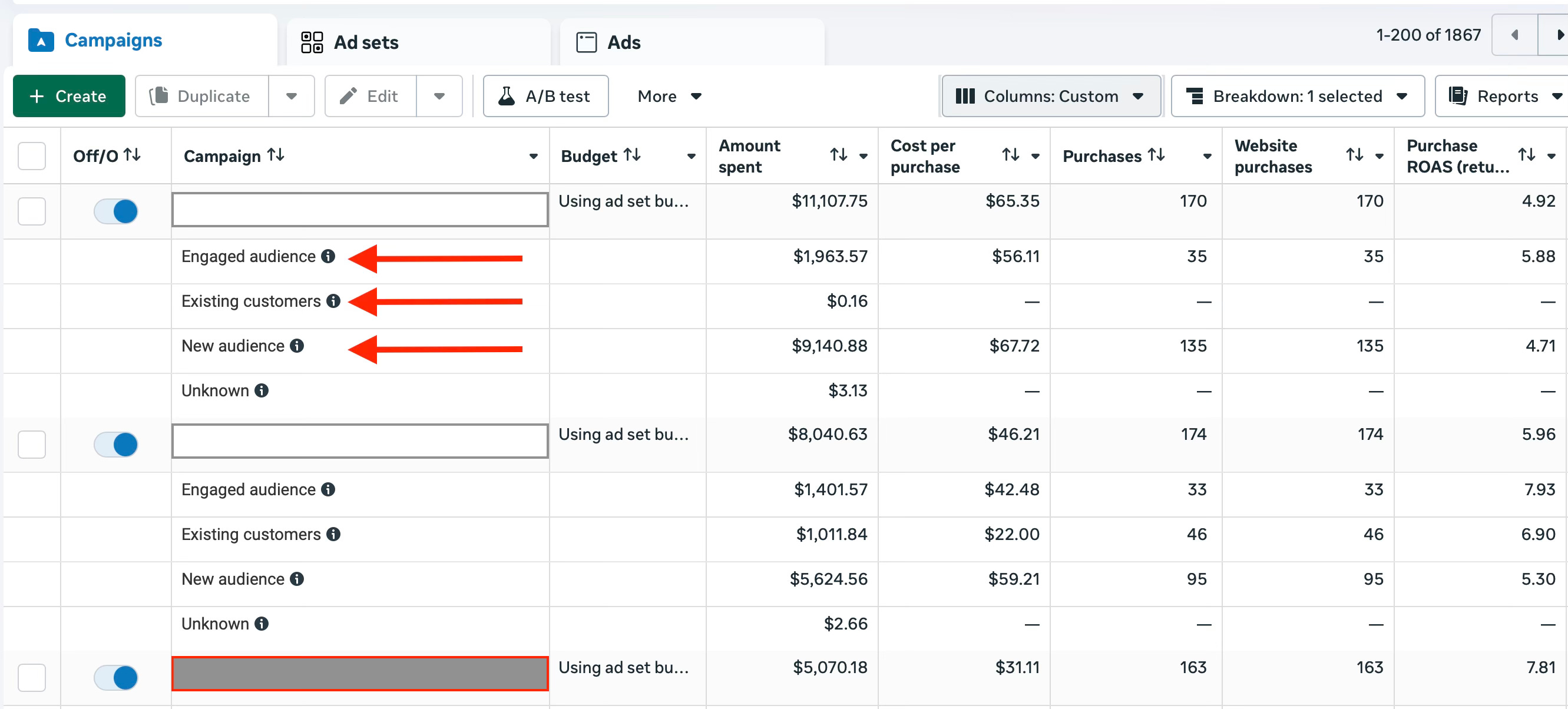 The benefit of defining these audiences is that in Ads Manager, under filters, you can select Audience segments and see your usual dashboard KPIs, spend, revenue, ROAS and cost per purchase, broken down into: